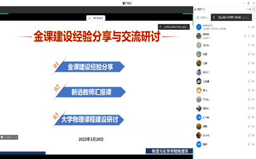 2023年3月28日晚上7点,为落实学校以及学院“两性一度”金课建设,bv1946伟德国际始于英国物理系开展了以“金课建设经验分享与交流研讨”为主题的线上会议,会议由物理系主任吴昌义主持,物理系全体教师参加了会议。会议内容包括三大部分内容:第一,金课建设经验分享;第二,新进教师汇报课;第三,大学物理课程建设研讨。
