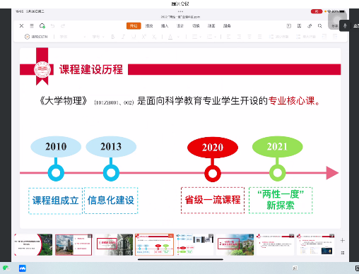 然后是新进教师许文昊老师进行汇报,针对大学物理课程的具体章节中如何融入两性一度和课程思政,以及结合自身优势融入科学前沿等方面进行了全面的汇报,特别是大学物理课程作为公共课,在提升学生学习兴趣方面进行了相关的探索和总结。