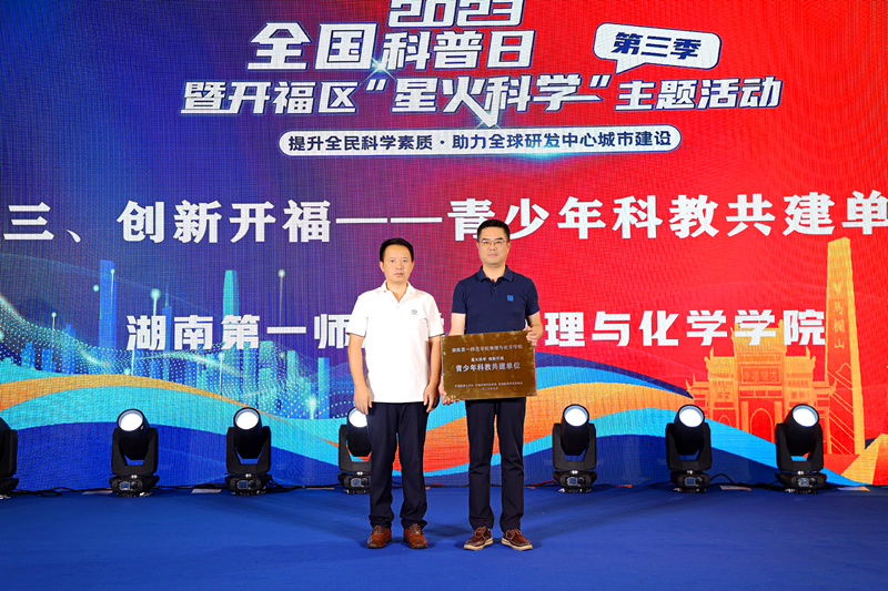 活动现场,我院学生为各位领导、嘉宾及与会代表表演了科普小品《魔动的纸片》;湖南省科协副主席为bv1946伟德国际始于英国颁发了“青少年科技共建单位”牌匾,陈志武代表学院接牌。