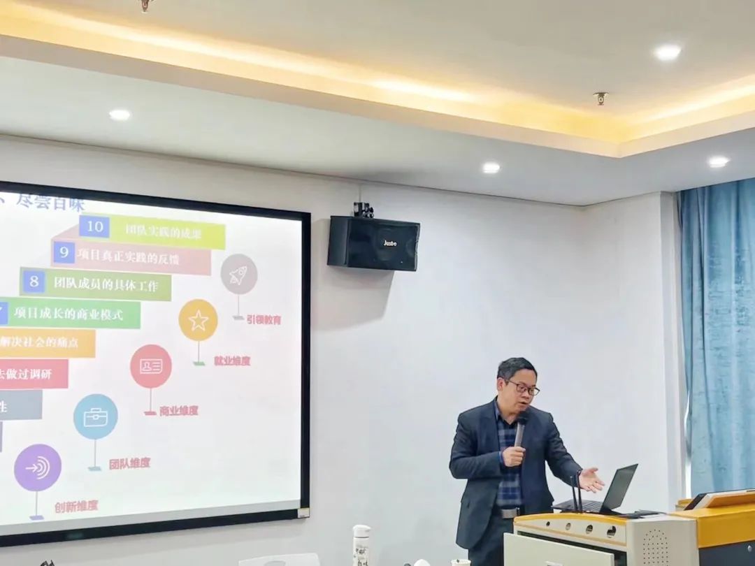 会议伊始,殷章馨以“跨界,成长,话赛事”为主题,简单介绍了大学生创新创业三大权威赛事及省级和国家层面的相关高校创业赛事。紧接着尹青军老师从创新创业内源精神、“互联网+”赛道组成、赛道规则,商业模式等几个方面进行了深度剖析,重点强调了赛事期间该如何进行准备,并从学生定位、导师定位、项目人员组成、项目完整度给出了合理化的建议。