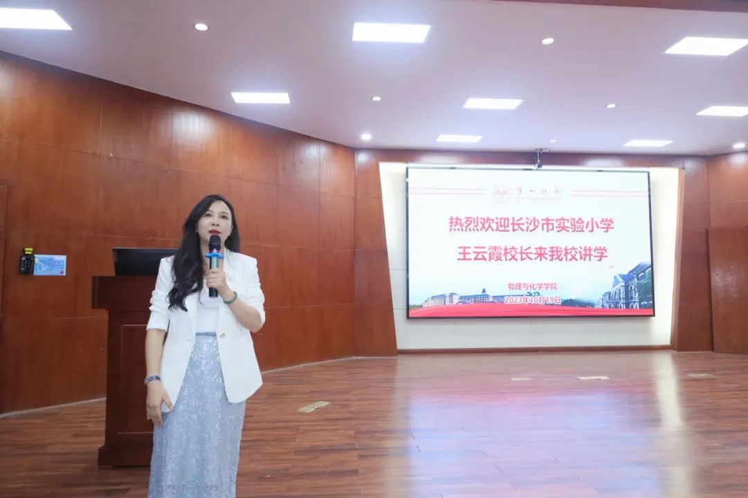 2023年10月19日,长沙市实验小学校长王云霞教授应邀来我校进行学术讲座。王云霞教授以“向美而行,荷趣绽放——长沙市实验小学课程体系重构的思考与实践”为题,在特立南112室为大家带来了一场精彩纷呈的学术报告。本次会议由许兰院长主持,我院部分师生代表参加了本次学术讲座。