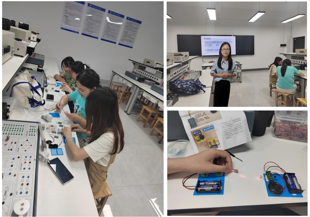 2024年5月21日我院青年教师陈慧博士在玉衡南楼107开展了本学期第三场实验室“开放日”活动,22级物理班的同学积极参与了本次活动。本次实验室开放日的主题为“激光传声实验”。陈慧老师首先讲解了激光传声的原理是由亮灭形式传递出去。并解释由于视觉暂留现象,我们观察不到激光的亮灭的情况。随后展示了发射端材料和接收端材料。接着,演示如何通过简单的元器件(光敏电阻、三极管、色环电阻、芯片等)搭建激光传声电路。最后,同学们在现场利用简单的实验材料,成功搭建了激光传声实验装置。