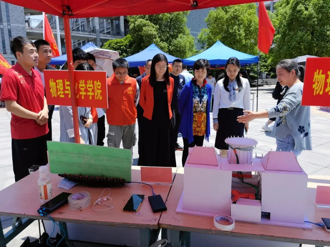 在作品展示过程中,我院曾琳娜老师、石慧老师就作品的工作原理、创意来源以及发展前景向观展师生进行详细的介绍,激起了同学们对科技创新的强烈兴趣。童校长一行在南湖红船和发展党员工作流程图前驻足良久,点头赞许,高度肯定了物化学子的智慧和创意,并询问本次科技作品的创新之处。接着,童校长就学院后期的科技作品如何发展进行了指导,同时勉励物化院学子们要积极参加此类科技实践活动,提高自身的专业能力和实践能力。
